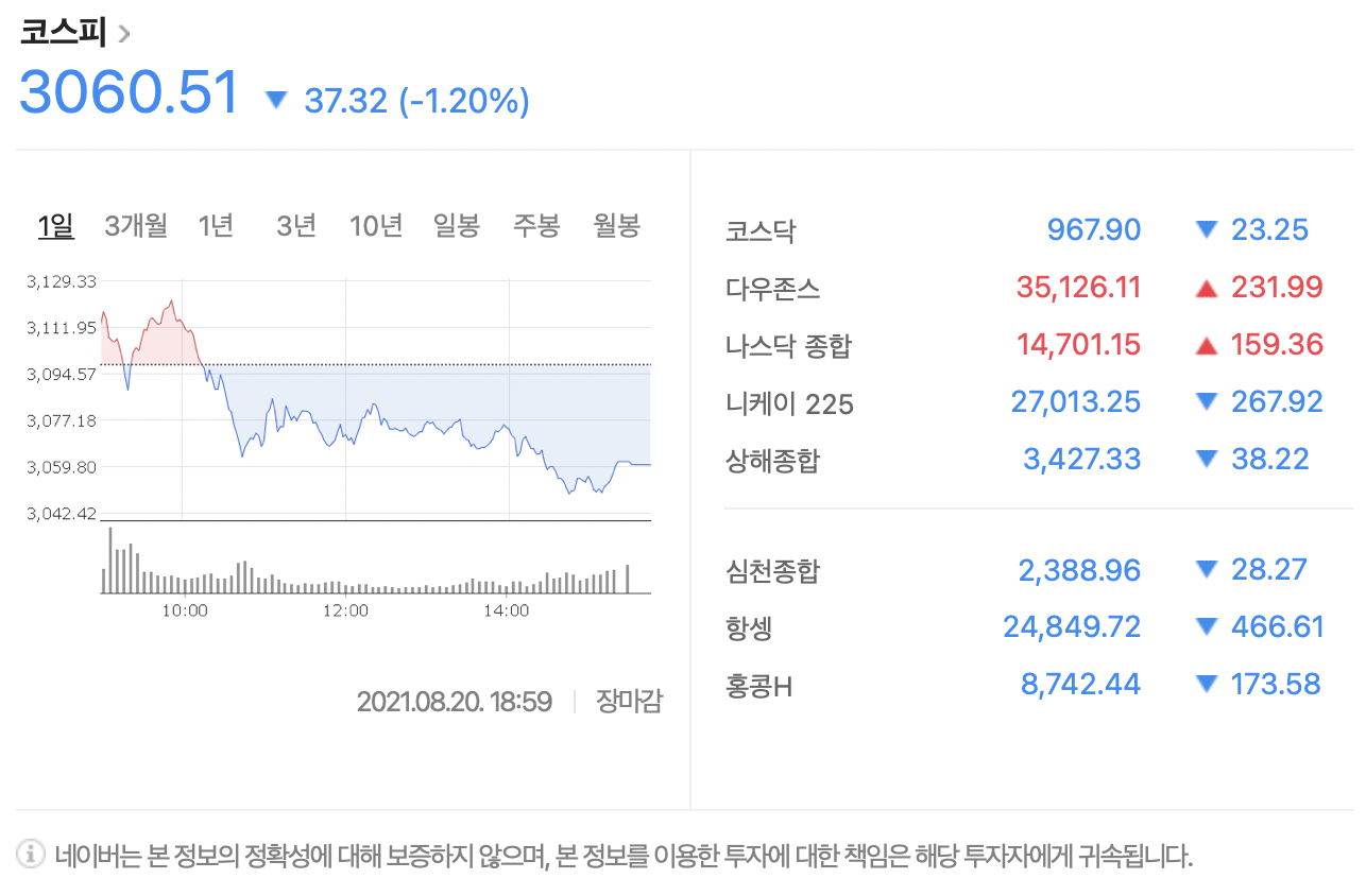 20일 기준 코스피지수가 3060.51로 마감했다. 3월 말 이후 5개월만에 최저치를 찍었다.